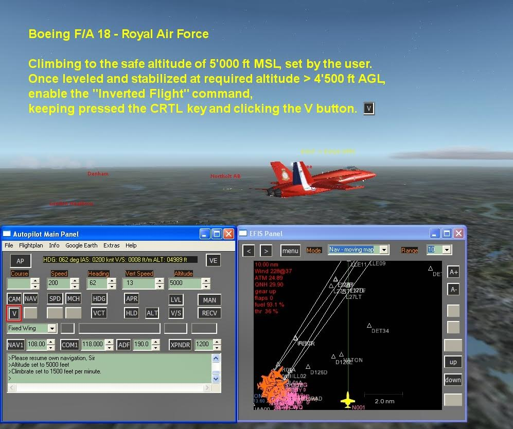 In FSXPilot, simply press the V button to enter inverted flight autopilot mode. For safety reasons,you must press the CTRL button simultaneously.